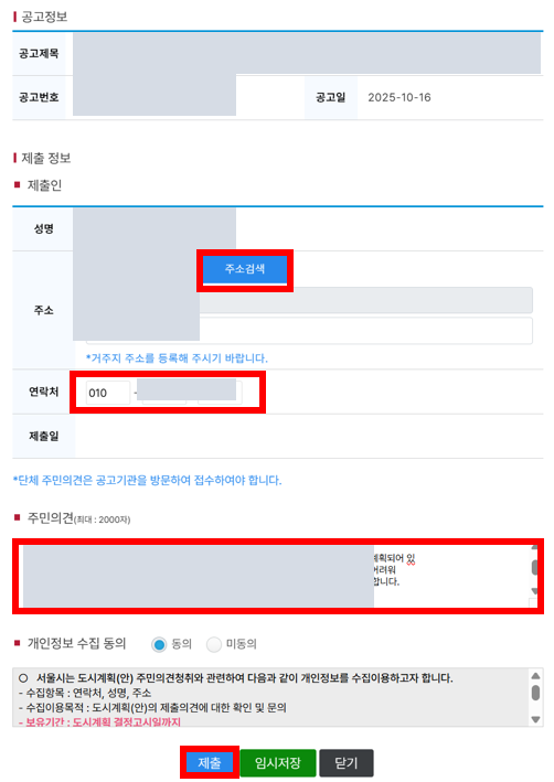 5. 주소검색 -> 연락처 -> 주민의견 -> 제출